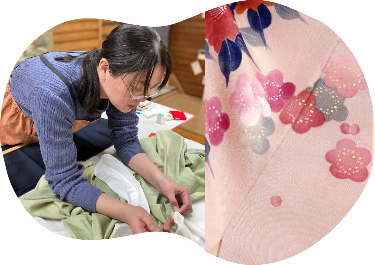 大切な着物を職人が丁寧にお直し。 着物の素敵な縁を紡ぎます。 大切な着物をいつまでも着てもらうために。丸洗い・しみ抜きなどクリーニングや【シミ隠し&柄足し】【家紋隠し】といったお直しも承っております。寸法が合わなくなった着物や譲り受けた着物をお直しする事で長くお召しいただけます。